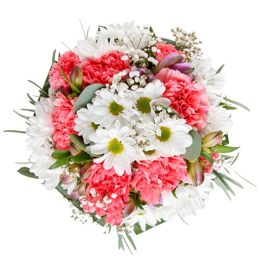Delight in the beauty and elegance of our carefully curated seasonal flower arrangement. This unique bouquet features a harmonious blend of snow-white chrysanthemums, delicate gypsophila, soft light pink carnations, and lush aspidistra leaves, creating a mesmerizing display of colors and textures.